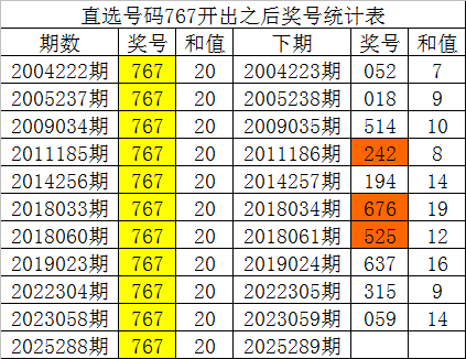 二、历史直选同号分析 福彩3D第2025288期开出直选号码为:767,该直选号码历史上出现了11次,其下期鉴识开出了号码:052、018、514、242、194、676、525、637、315、059,如图: