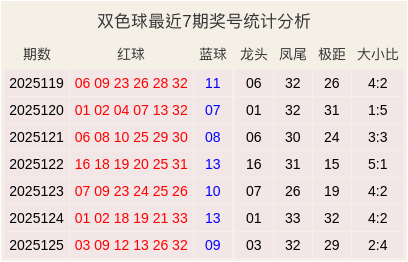 上期双色球的开奖号码中,龙头凤尾组合为03+32,极距为29,大小比为2:4。 双色球最近7期奖号和数据分析表