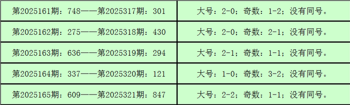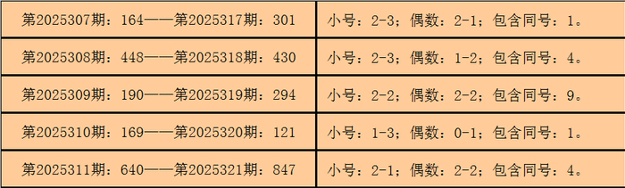 胆码: 福彩3D第2025317期-第2025321期纠合5期开出号码划分为:301-430-294-121-847。 其中,小 号出现了12个,小 号进展活跃;偶数号码出现了8个,基本抓平;1路号码走热。 统计3D历史上已开出的奖号发现,在纠合5期开奖号码中:3D在第2025307期-第2025311期划分开出奖号:164-448-190-169-640。 其中,小 号出现了9个,小 号进展活跃;偶数号码出现了10个,偶数号码进展活跃,2路号码走冷。且每期奖号与最近5期开奖所开出的号码皆有同号。