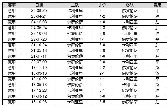 佛罗伦萨 VS 卡利亚里两队近10年的交战次数为17场,佛罗伦萨9胜5平3负,赢球概率为52.9%,平局概率为29.4%,输球概率为17.6%。