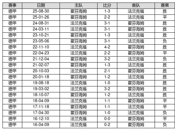 法兰克福 VS 霍芬海姆两队近10年的交战次数为20场,法兰克福11胜5平4负,赢球概率为55.0%,平局概率为25.0%,输球概率为20.0%。