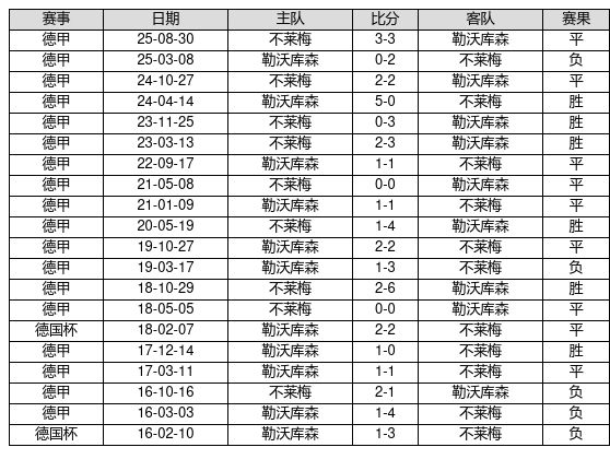勒沃库森 VS 不莱梅两队近10年的交战次数为20场,勒沃库森6胜9平5负,赢球概率为30.0%,平局概率为45.0%,输球概率为25.0%。