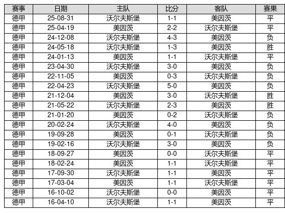 好意思因茨 VS 沃尔夫斯堡两队近10年的交战次数为20场,好意思因茨3胜9平8负,赢球概率为15.0%,平局概率为45.0%,输球概率为40.0%。
